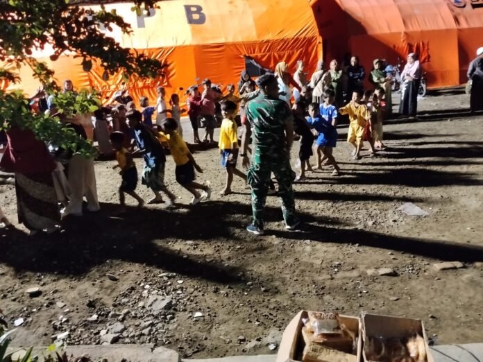 Lumajang — Upaya pemulihan kondisi psikologis anak-anak pengungsi akibat erupsi Gunung Semeru terus dilakukan oleh berbagai pihak. Pada Senin malam (1/12/2025), Babinsa Oro-oro Ombo Koramil 0821-14/Pronojiwo, Serda Yayat Sugiyat bersama para relawan menggelar kegiatan permainan bersama anak-anak di lokasi pengungsian yang berada di SMPN 02 Pronojiwo.