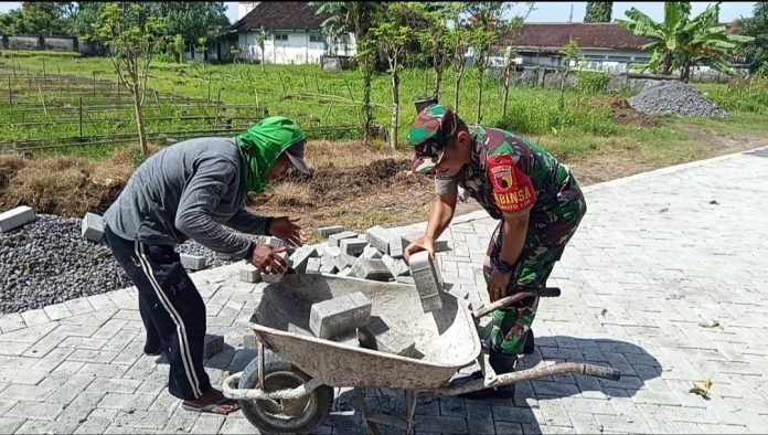 Lumajang, Sebagai bentuk dukungan terhadap pembangunan infrastruktur pedesaan, Babinsa Kaliboto Lor Koramil 0821-12/Jatiroto, Sertu Syafiudin, melaksanakan pendampingan dan pengawalan pemasangan paving block di Dusun Persil Nyeoran RT 049 RW 011 Desa Kaliboto Lor, Kecamatan Jatiroto, Kabupaten Lumajang, Jawa Timur, Senin (11/8/2025).