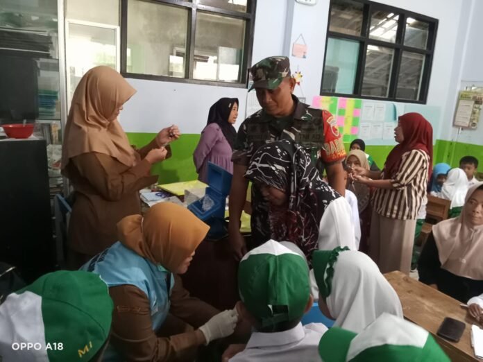 Lumajang, Babinsa Oro Oro Ombo Koramil 0821-14/Pronojiwo, Serda Yayat Sugiat, melaksanakan pendampingan kegiatan pelayanan imunisasi cacar, pemberian obat cacing, dan vitamin kepada siswa sekolah dasar di wilayah binaannya. Kegiatan ini berlangsung di MI Ma’arif Nurul Islam Dusun Kampung Renteng dan MI Bustanul Ulum Dusun Sumberbulus, Desa Oro Oro Ombo, Kecamatan Pronojiwo, Kabupaten Lumajang, Jawa Timur, pada Selasa (2/9/2025).