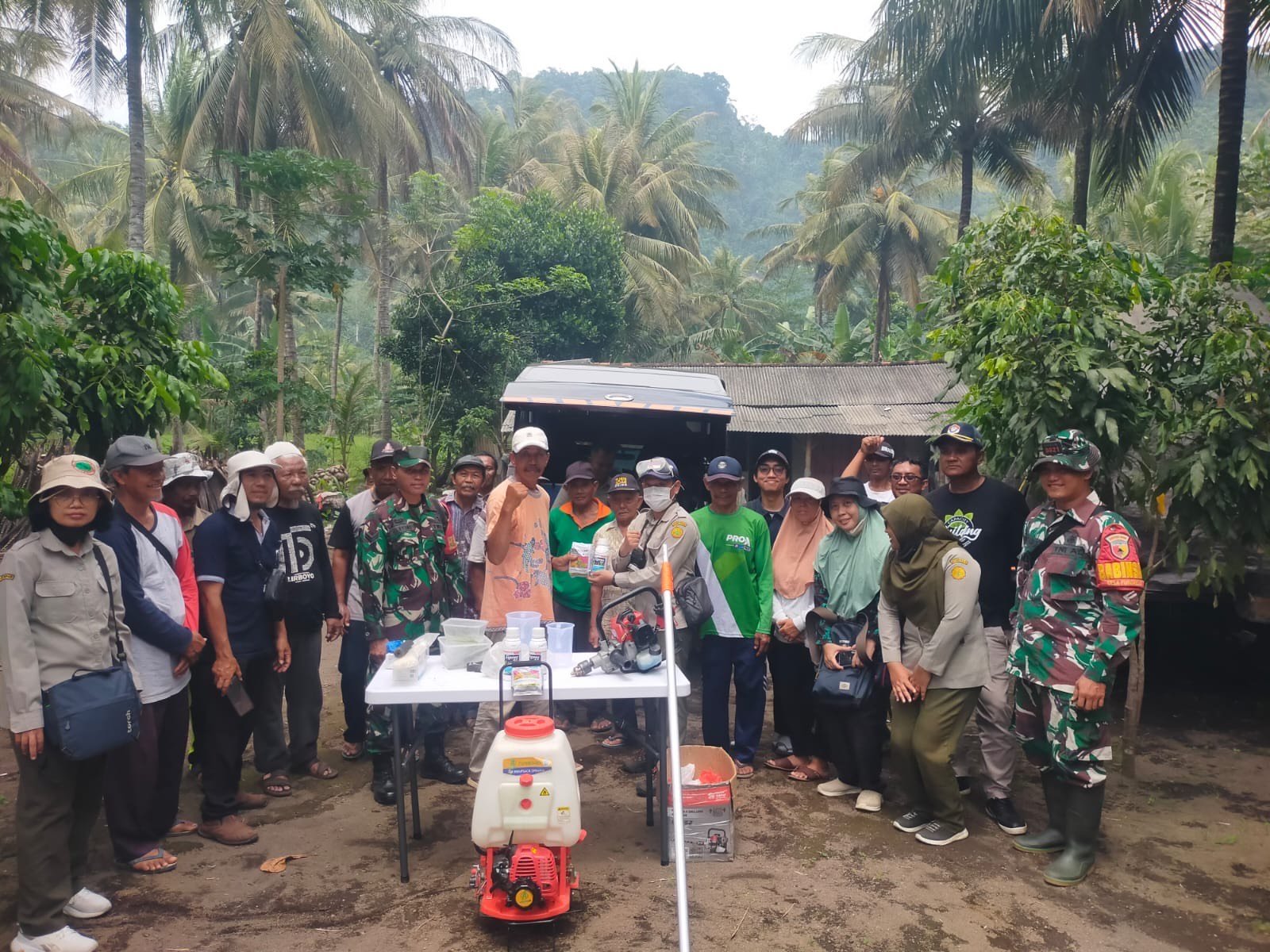 Lumajang, Babinsa Tegalrejo Koramil 0821-18/Tempursari, Sertu Hartono, mendampingi Forkopimcam Tempursari dalam kegiatan sosialisasi penggunaan obat desinfektan sekaligus penyemprotan hama ulat kelapa dari Dinas Perkebunan Provinsi Jawa Timur. Kegiatan tersebut dilaksanakan di Dusun Tegalsari, Desa Tegalrejo, Kecamatan Tempursari, Kabupaten Lumajang, Jawa Timur, pada Minggu (28/12/2025).