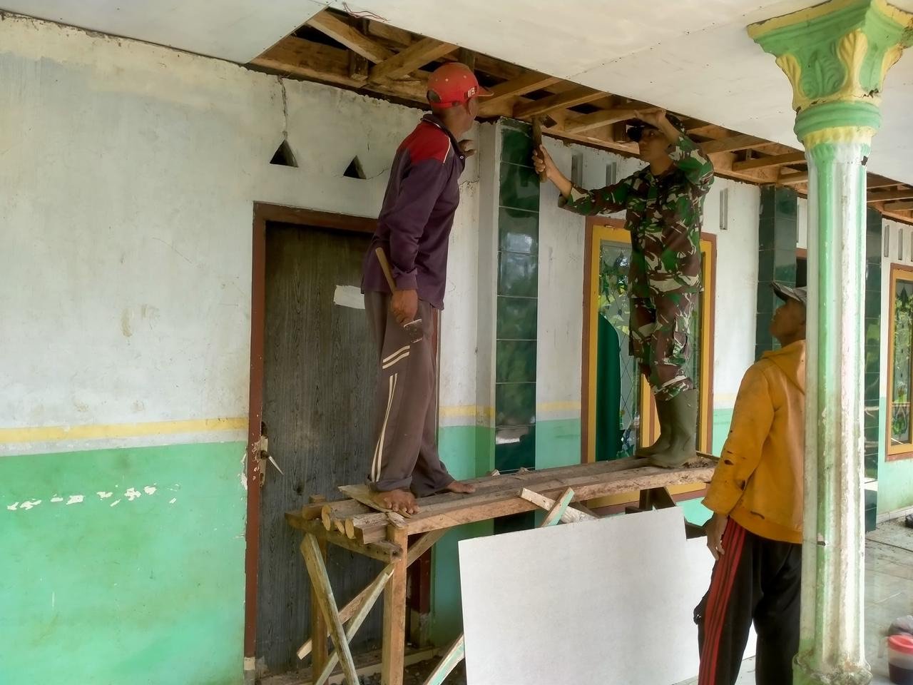 Dengan penuh keakraban, Babinsa bersama warga setempat melakukan pembongkaran bagian atap yang rusak dan menggantinya dengan material baru. Kehadiran Babinsa tidak hanya membantu secara fisik, tetapi juga memberi motivasi dan rasa aman bagi warga yang sedang membutuhkan bantuan.