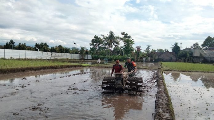 Lumajang, Dalam rangka mendukung program ketahanan pangan nasional, Babinsa Tanggung Koramil 0821-20/Padang, Serda Muhammad Sholeh Ridwan, melaksanakan pendampingan kegiatan pembajakan sawah milik Kelompok Tani (Poktan) Wargo Manunggal yang berada di Dusun Ploso RT 008 RW 010 Desa Tanggung, Kecamatan Padang, Kabupaten Lumajang, Jawa Timur, pada Jumat (13/6/2025).