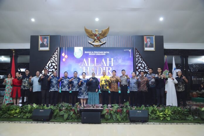 Lumajang, Kasdim 0821/Lumajang Mayor Inf Tanuri bersama unsur Forum Koordinasi Pimpinan Daerah (Forkopimda) Kabupaten Lumajang menghadiri ibadah dan perayaan Natal yang diselenggarakan oleh Badan Kerjasama Antar Gereja (BKSAG) Kabupaten Lumajang, bertempat di Pendopo Arya Wiraraja Kabupaten Lumajang, Jumat (30/1/2026).