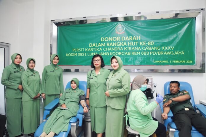 Lumajang – Dalam rangka memperingati Hari Ulang Tahun (HUT) ke-80 Persit Kartika Chandra Kirana tahun 2026, Persit Kartika Chandra Kirana Cabang XXXV Kodim 0821/Lumajang melaksanakan kegiatan bakti sosial donor darah. Kegiatan tersebut bertempat di Kantor Palang Merah Indonesia (PMI) Kabupaten Lumajang. Kamis(5/2/2026)