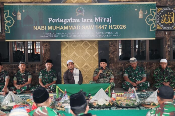 Lumajang, Kodim 0821/Lumajang memperingati Isra’ Mi’raj Nabi Muhammad SAW 1447 Hijriah/2026 Masehi, bertempat di Mushola At-Taqwa Makodim 0821/Lumajang, Jumat (30/1/2026). Kegiatan keagamaan ini mengusung tema “Meneladani Akhlak Rasulullah SAW Membentuk Karakter Prajurit yang Prima Guna Menuju Indonesia Maju.”