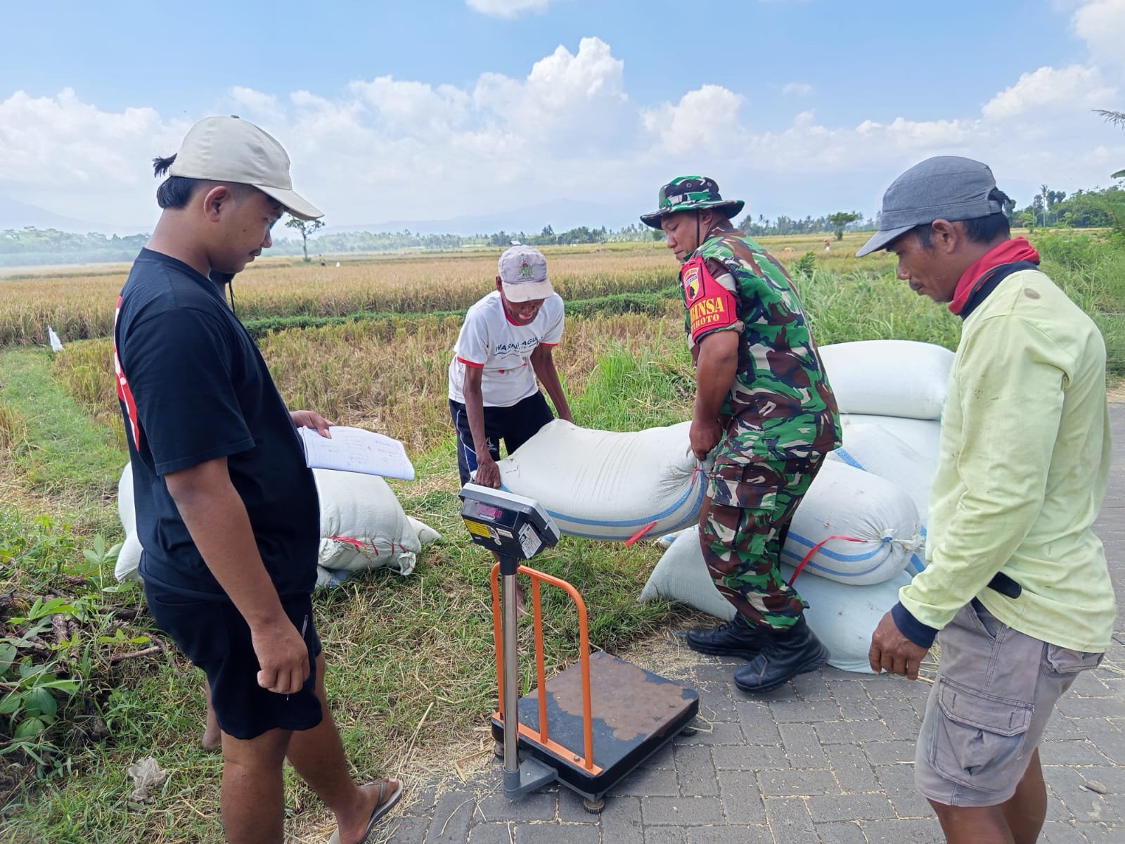 Lumajang, Dalam rangka mendukung ketahanan pangan nasional, Babinsa Sukosari Koramil 0821-12/Jatiroto, Serka Samsuliadi Dwi Purwanto, turut serta dalam kegiatan percepatan serapan gabah dan beras (Sergab) yang dilaksanakan oleh Kelompok Tani (Poktan) Karya Tani di Desa Sukosari, Kecamatan Jatiroto, Kabupaten Lumajang, Jawa Timur, pada Rabu (18/6/2025).