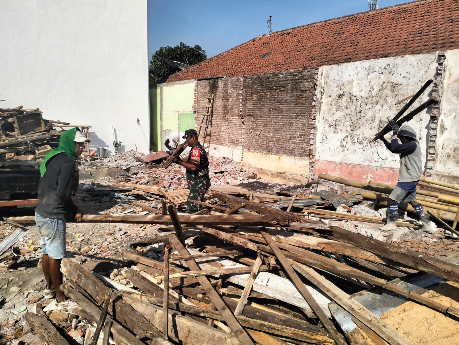 Warga bersama TNI bahu membahu membongkar bagian bangunan musala yang sudah mulai lapuk, untuk kemudian direnovasi menjadi lebih layak, nyaman, dan kokoh sebagai sarana ibadah serta kegiatan keagamaan masyarakat setempat.