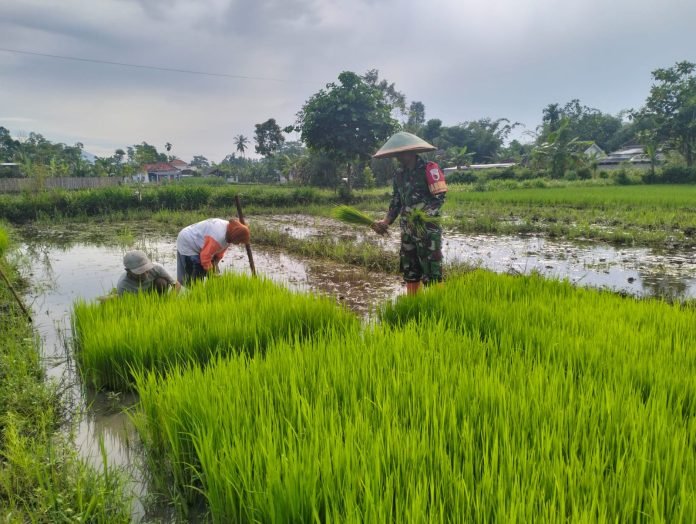 Lumajang, Sebagai bentuk komitmen dalam mendukung program ketahanan pangan nasional, Babinsa Tempeh Tengah Koramil 0821-10/Tempeh, Serda Basuki, melaksanakan pendampingan kepada petani dalam kegiatan pencabutan bibit padi di Dusun Kebonan, Desa Tempeh Tengah, Kecamatan Tempeh, Kabupaten Lumajang, Jawa Timur, pada Minggu (20/7/2025).