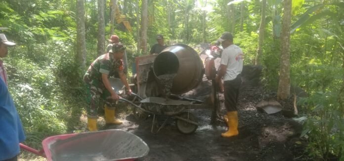 Lumajang – Upaya peningkatan infrastruktur desa terus dilakukan melalui semangat gotong royong bersama warga. Babinsa Tunjung Koramil 0821-04/Gucialit, Serma Masruri, melaksanakan kegiatan pendampingan kerja bakti pembangunan jalan rabat beton sepanjang 100 meter di Dusun Sekar Tanjung RT 003 RW 003 Desa Tunjung, Kecamatan Gucialit, Kabupaten Lumajang, pada Minggu (5/4/2026).