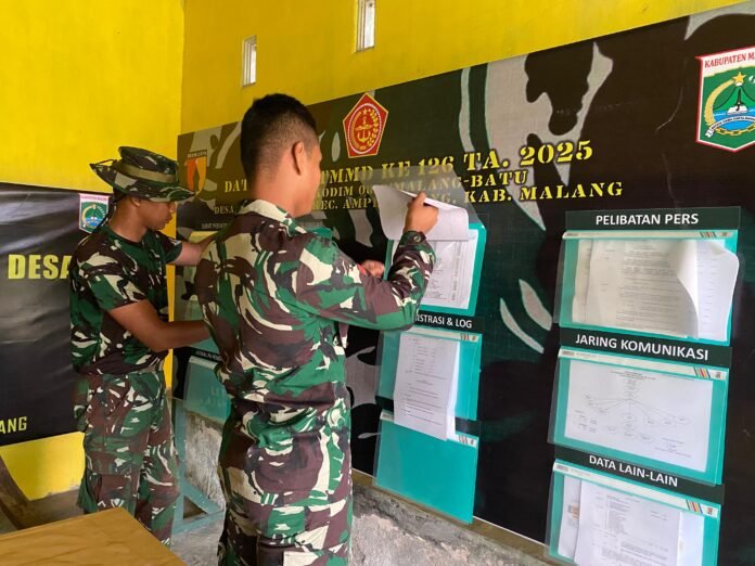 Malang, TMMD ke 126 – Dalam rangka memastikan seluruh kegiatan berjalan sesuai perencanaan, personel Satgas TNI Manunggal Membangun Desa (TMMD) ke-126 Kodim 0818/Malang melaksanakan pemeriksaan data pada papan sketsel Posko TMMD yang berlokasi di Desa Lebakharjo, Kecamatan Ampelgading, Kabupaten Malang, Selasa (14/10/2025).