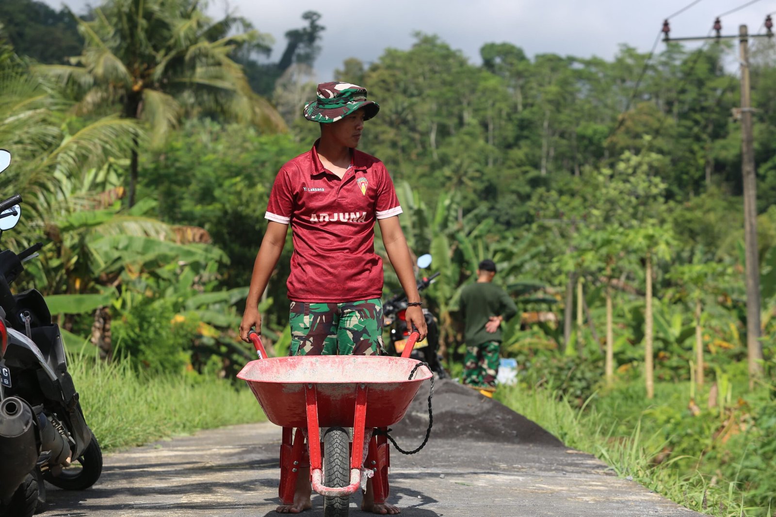 Malang, TMMD ke 126 — Dengan penuh semangat dan dedikasi tinggi, Prajurit Kepala (Praka) Saiful Anwar, salah satu personel Satgas TNI Manunggal Membangun Desa (TMMD) ke-126 Kodim 0818/Malang-Batu, tampak mengangkat material tanah hasil galian menggunakan arco di lokasi pembuatan drainase, Dusun Krajan IA, Desa Lebakharjo, Kecamatan Ampelgading, Kabupaten Malang, Kamis (16/10/2025).