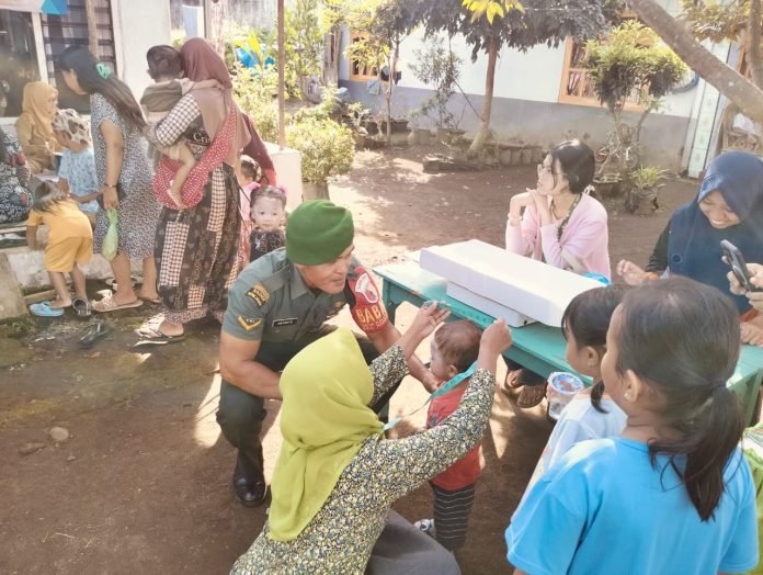 Lumajang, Dalam upaya mendukung peningkatan pelayanan kesehatan masyarakat, khususnya ibu dan anak, Babinsa Kalipenggung Koramil 0821-07/Randuagung, Serda Aryanto, turut mendampingi kegiatan Posyandu Arjuna yang berlangsung di Dusun Jabaan RT 012 RW 015, Desa Kalipenggung, Kecamatan Randuagung, Kabupaten Lumajang, Jawa Timur, pada Selasa (29/7/2025).