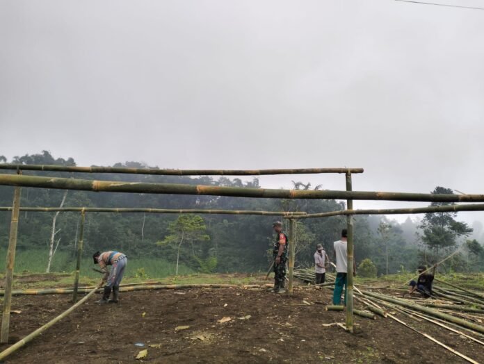 Lumajang – Wujud nyata kemanunggalan TNI dengan rakyat kembali terlihat di wilayah Kecamatan Gucialit. Babinsa Desa Sombo Koramil 0821-04/Gucialit, Serda Sutawi, turun langsung membantu warga melaksanakan kerja bakti pemasangan tenda sebagai tempat penyimpanan material pembangunan Masjid Assomadiyah di Dusun Argodadi RT 004 RW 002, Desa Sombo, Kecamatan Gucialit, Kabupaten Lumajang, Jawa Timur, pada Minggu (2/2/2026).