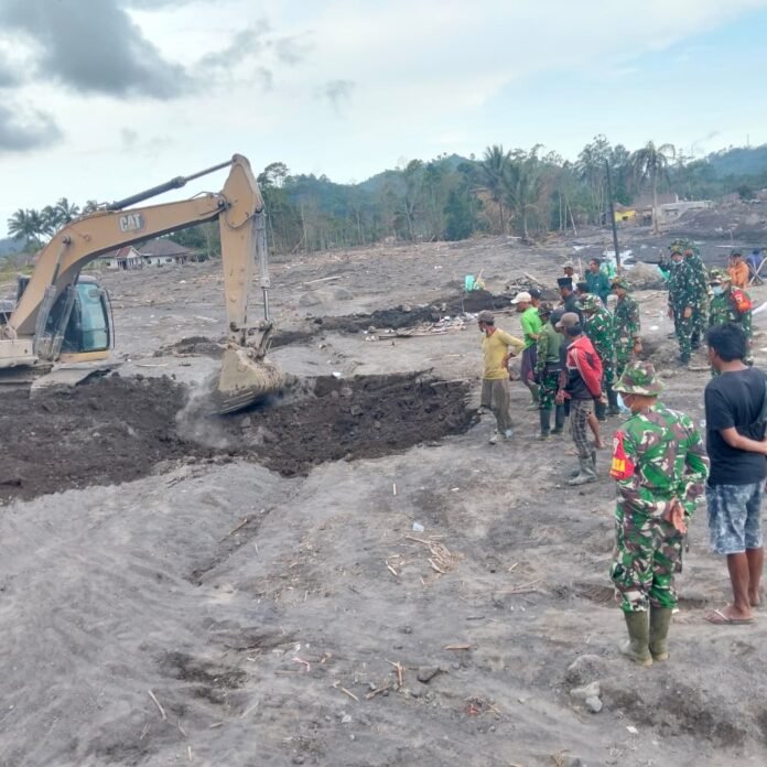 Lumajang — Upaya pemulihan pascaerupsi Gunung Semeru terus dilakukan secara intensif oleh aparat dan relawan di wilayah terdampak. Pada Selasa (2/12/2025), personel gabungan dari Kodim 0821/Lumajang dan Yonif 527/BY kembali diterjunkan untuk mengevakuasi puing-puing rumah warga yang tertimbun material vulkanik di Dusun Sumbersari, RT 009 RW 004, Desa Supiturang, Kecamatan Pronojiwo.