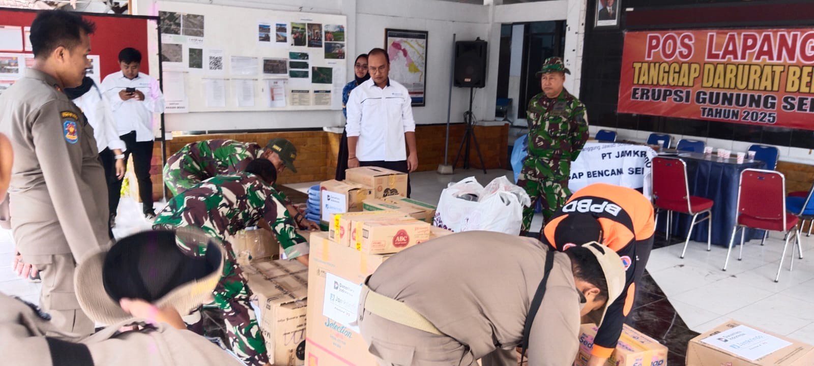 Lumajang — Upaya pemulihan pasca erupsi Gunung Semeru kembali diperkuat melalui sinergi lintas instansi. Personel Kodim 0821/Lumajang bersama Satpol PP dan relawan menurunkan logistik bantuan di Posko Terpadu Desa Supiturang, Kecamatan Pronojiwo, pada Rabu (3/12/2025). Kegiatan itu dilakukan untuk memastikan seluruh bantuan yang masuk dapat terdistribusi secara tepat sasaran serta tercatat dengan baik untuk kebutuhan warga terdampak.