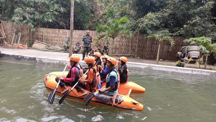 Lumajang, Dalam rangka meningkatkan kesiapsiagaan generasi muda dalam menghadapi potensi bencana alam, Babinsa Purwosono Koramil 0821-19/Sumbersuko, Serka Masrohim Atmajaya Putra, turut mendampingi kegiatan pelatihan penggunaan perahu karet jenis LCR (Landing Craft Rubber) yang dilaksanakan di kawasan Kalisejuk, Desa Purwosono, Kecamatan Sumbersuko, Kabupaten Lumajang, Jawa Timur, pada Minggu (22/6/2025).