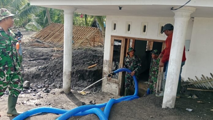 Pembersihan dilakukan di beberapa rumah yang terdampak paling parah, di mana material lahar dingin berupa lumpur pekat masuk hingga ke dalam ruangan dan merusak perabotan warga. Dengan menggunakan selang bertekanan, Serda Samsul bersama warga menggelontor lantai, dinding, dan halaman rumah agar kembali layak ditempati.