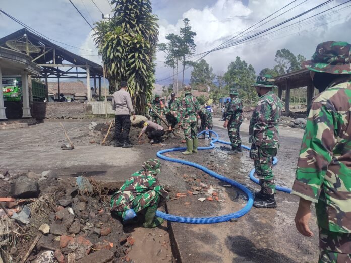 Dengan metode glontor yakni mendorong dan menghanyutkan material menggunakan tekanan air serta pembukaan aliran secara bertahap personel TNI bekerja cepat untuk mengembalikan fungsi saluran drainase yang tertimbun pasir dan lumpur pascaluncuran lahar dingin.