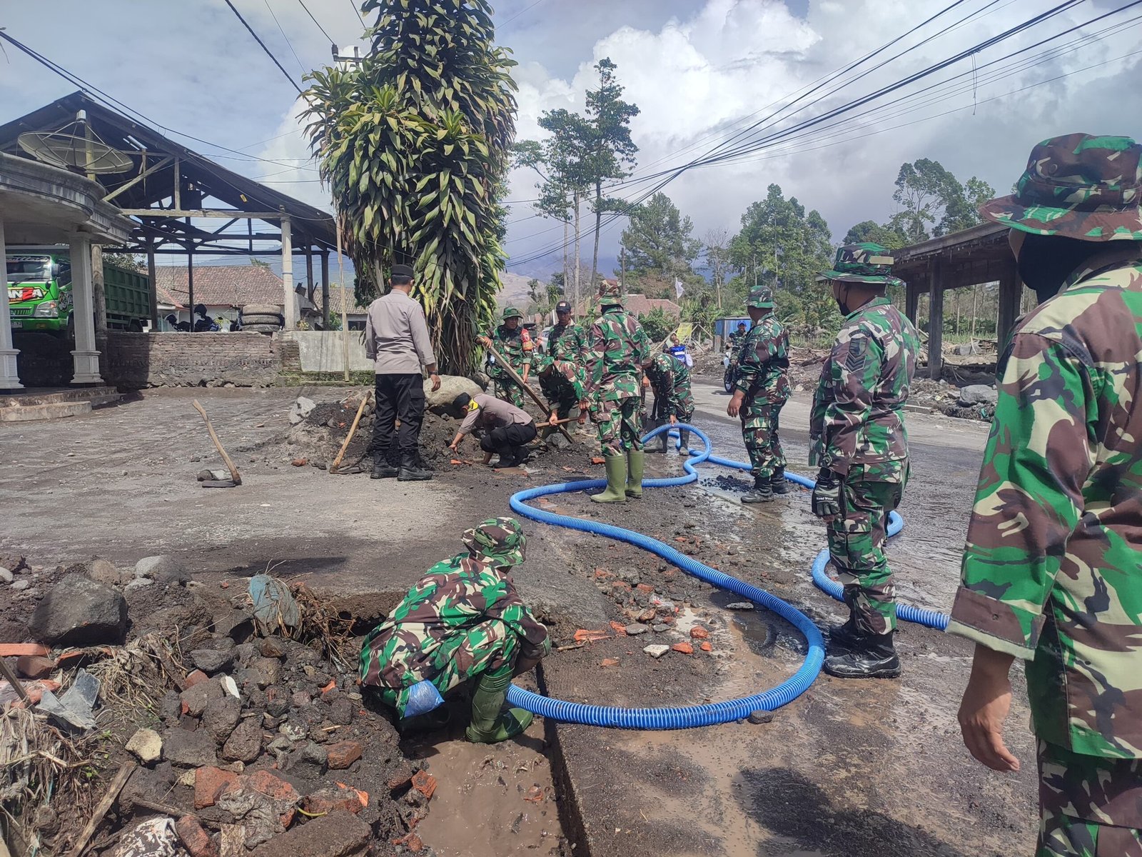Material lahar yang menumpuk menyebabkan aliran air tersendat, sehingga berpotensi menimbulkan genangan baru dan memperparah kerusakan lingkungan. Melihat kondisi tersebut, Peltu Danang langsung menggerakkan anggotanya untuk mengambil langkah cepat dan terukur.