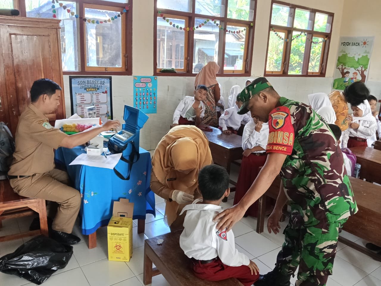S.Pd.SD., serta Bidan Desa Bence, Novia Erni Yusnita, Amd.Keb., yang secara langsung memberikan imunisasi kepada para siswa dengan didampingi oleh guru-guru sekolah.
