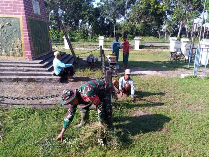 Warisi Semangat Pahlawan, Babinsa dan Warga Nogosari Bersihkan Monumen Mayjen Sukertiyo