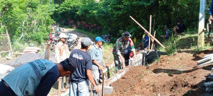 Lumajang, Bentuk kepedulian dan sinergitas antara TNI dan masyarakat kembali ditunjukkan melalui aksi nyata, Babinsa Tunjung Koramil 0821-04/Gucialit, Serma Masruri bersama warga melaksanakan kerja bakti pembangunan pagar tempat parkir Tempat Pemakaman Umum (TPU) di Dusun Sidomulyo RT 002 RW 007 Desa Tunjung, Kecamatan Gucialit, Kabupaten Lumajang, Jawa Timur, Pada Minggu (6/7/2025).